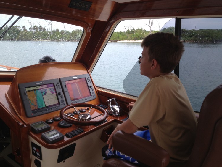 A captain in the making. The best advise a can give him is to, “only approach something as fast as he want’s to hit it”. Look at the farce concentration. He stood a 3 hour watch running the boat up the ICW in South Florida.