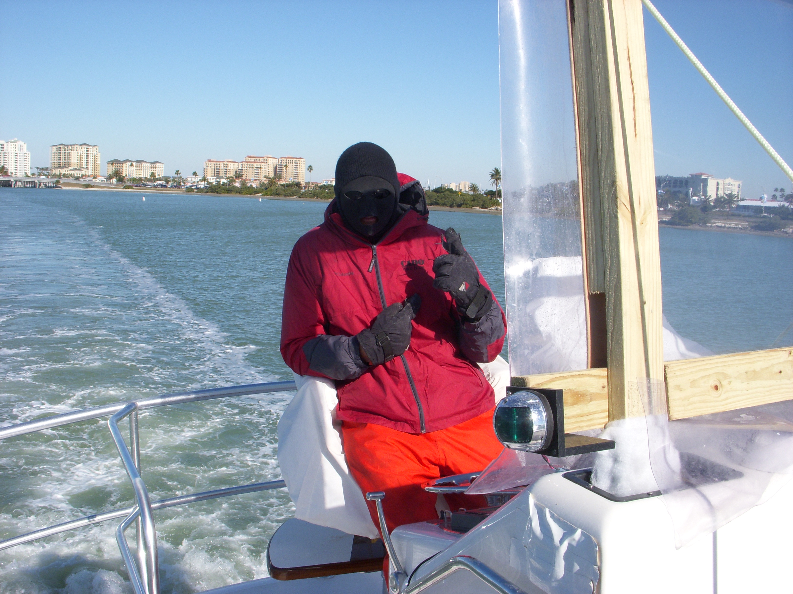 Delivering a vessel in the winter can be an adventure that some may not want to undertake? But for many professional mariners, there is no choice but to find a way to get it done. Captain CABO Joe, underway, ready to cross the Gulf of Mexico, from Mobile, AL to Miami, FL in February. Notice the makeshift wind screen, even has make shift running lights. It was in the upper 20’s, with 10 to 12 foot seas for the crossing.